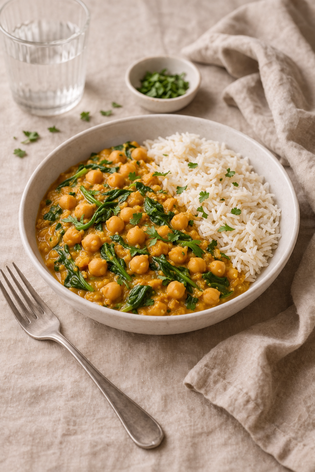 Dahl indien de pois chiches et épinards au lait de coco accompagné de riz thaï.